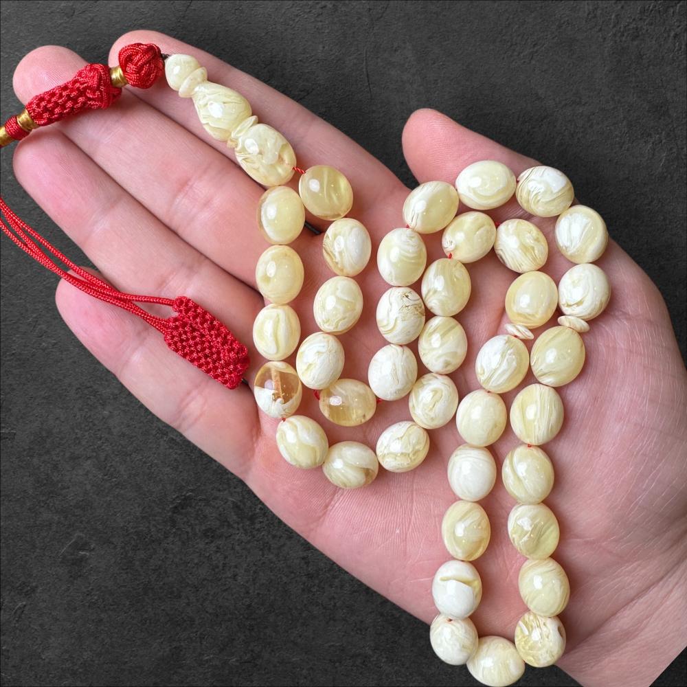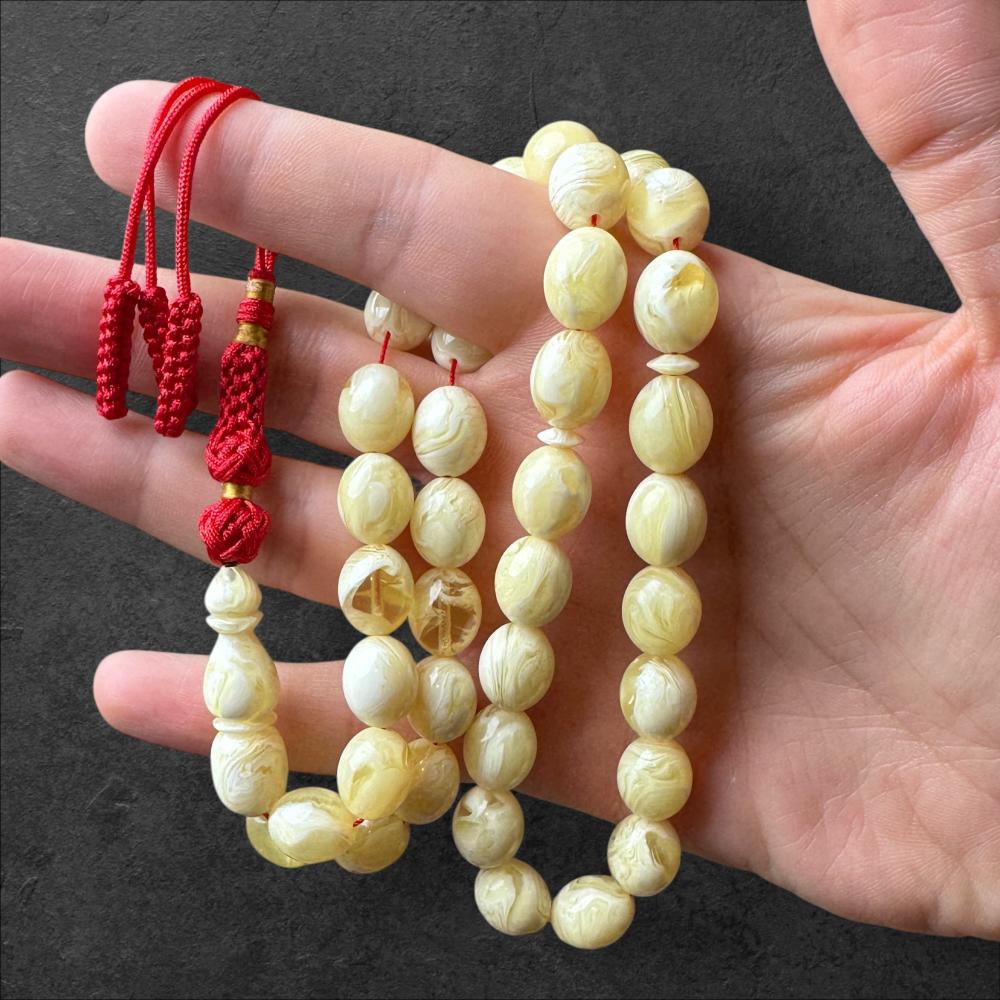 خامة المستكة من الخامات النادرة والمرغوبة في عالم السبح، حيث تتميز بالوانها الفريدة وملمسها الناعم . كل سبحة مستكة تختلف عن الاخرى